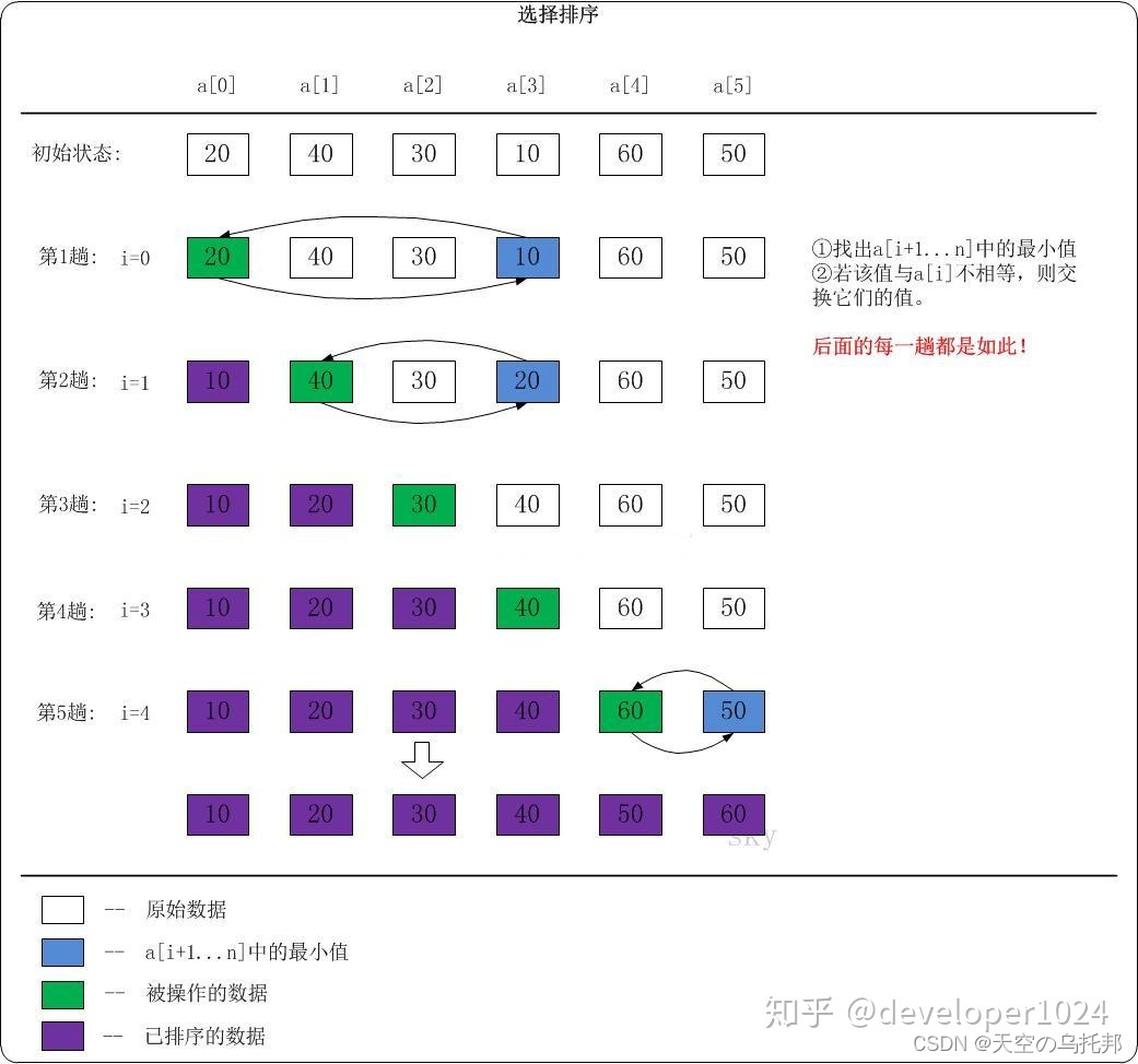 所谓选择排序就是通过对整体的选择,每一趟从前往后查找出无序区最小值,将最小值交换至无序区最前面的位置。