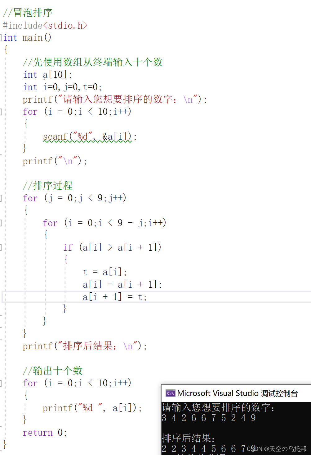 //冒泡排序 #include<stdio.h> int main() { //先使用数组从终端输入十个数 int a[10]; int i=0,j=0,t=0; printf("请输入您想要排序的数字:\n"); for (i = 0;i < 10;i++) { scanf("%d", &a[i]); } printf("\n"); //排序过程 for (j = 0;j < 9;j++) { for (i = 0;i < 9 - j;i++) { if (a[i] > a[i + 1]) { t = a[i]; a[i] = a[i + 1]; a[i + 1] = t; } } } printf("排序后结果:\n"); //输出十个数 for (i = 0;i < 10;i++) { printf("%d ", a[i]); } return 0; }