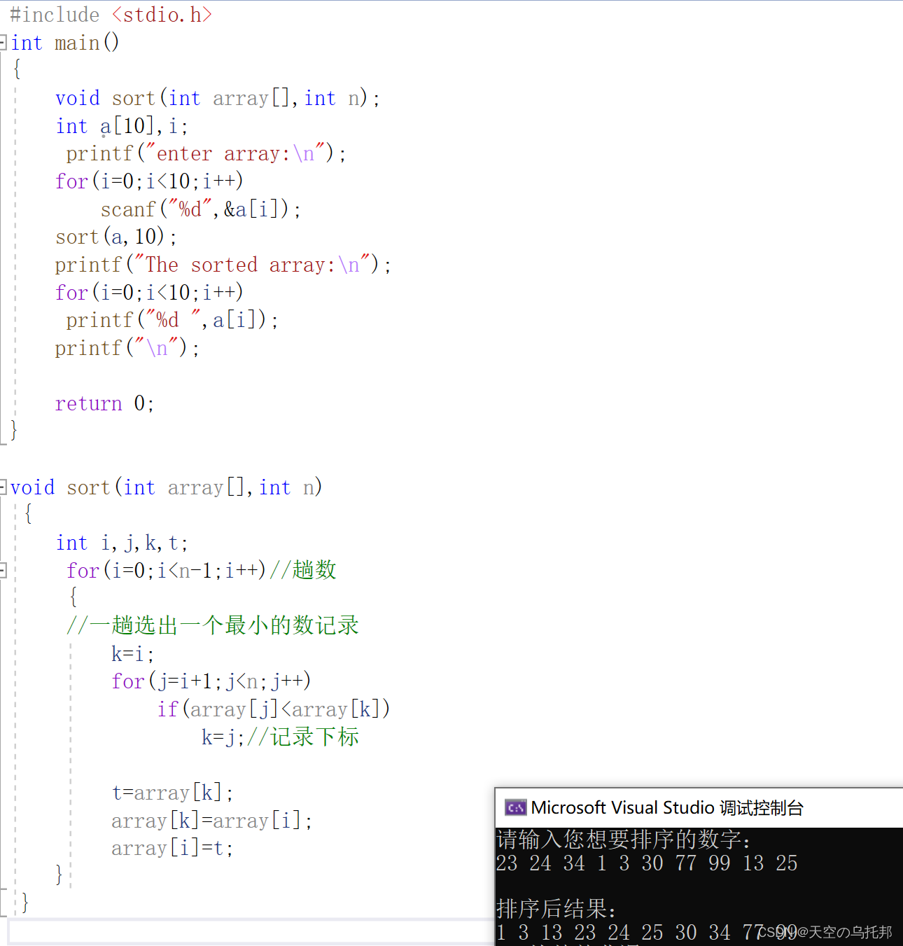 #include <stdio.h> int main() { void sort(int array[],int n); int a[10],i; printf("enter array:\n"); for(i=0;i<10;i++) scanf("%d",&a[i]); sort(a,10); printf("The sorted array:\n"); for(i=0;i<10;i++) printf("%d ",a[i]); printf("\n"); return 0; } void sort(int array[],int n) { int i,j,k,t; for(i=0;i<n-1;i++)//趟数 { //一趟选出一个最小的数记录 k=i; for(j=i+1;j<n;j++) if(array[j]<array[k]) k=j;//记录下标 t=array[k]; array[k]=array[i]; array[i]=t; } }