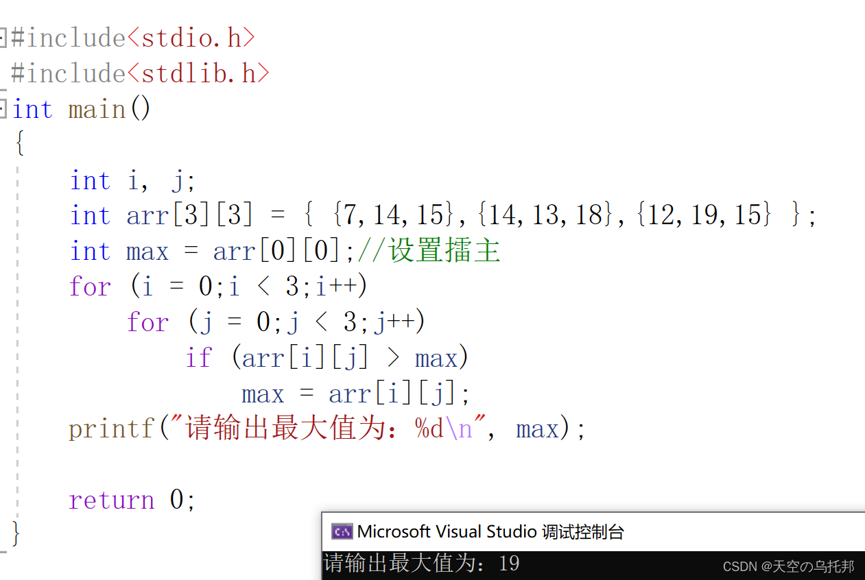 #include<stdio.h> #include<stdlib.h> int main() { int i, j; int arr[3][3] = { {7,14,15},{14,13,18},{12,19,15} }; int max = arr[0][0];//设置擂主 for (i = 0;i < 3;i++) for (j = 0;j < 3;j++) if (arr[i][j] > max) max = arr[i][j];//比擂主大就交换擂主 printf("请输出最大值为:%d\n", max); return 0; }