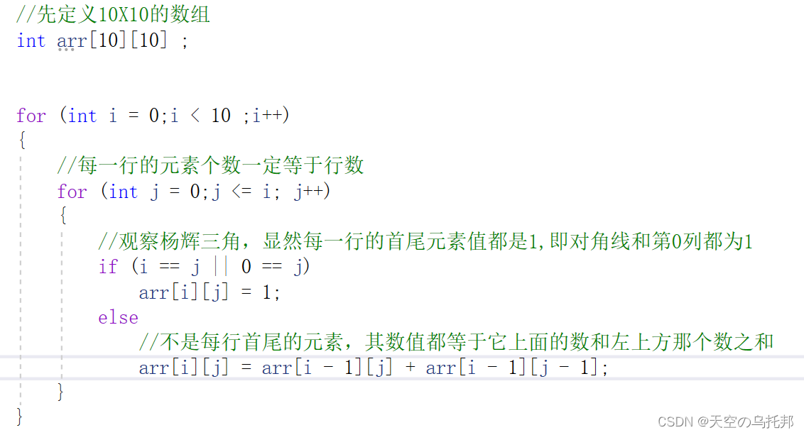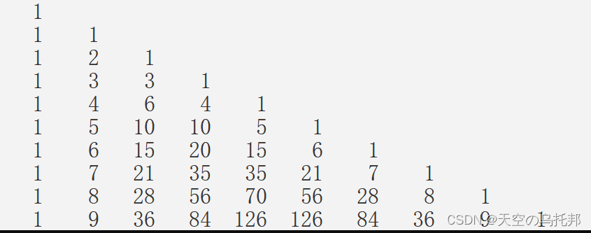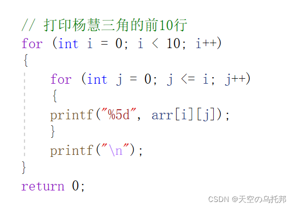 #include<stdio.h> int main() { //先定义10X10的数组 int arr[10][10] ; for (int i = 0;i < 10 ;i++) { //每一行的元素个数一定等于行数 for (int j = 0;j <= i; j++) { //观察杨辉三角,显然每一行的首尾元素值都是1,即对角线和第0列都为1 if (i == j || 0 == j) arr[i][j] = 1; else //不是每行首尾的元素,其数值都等于它上面的数和左上方那个数之和 arr[i][j] = arr[i - 1][j] + arr[i - 1][j - 1]; } } // 打印杨慧三角的前10行 for (int i = 0; i < 10; i++) { for (int j = 0; j <= i; j++) { printf("%5d", arr[i][j]); } printf("\n"); } return 0; }
