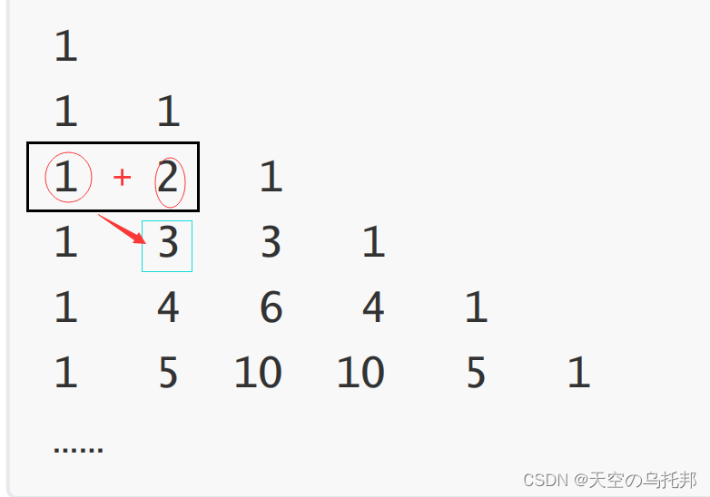 第0列和对角线上的数据全部为1,其余位置上的数据为上一行正对数据与上一行正对前一个数据之和。