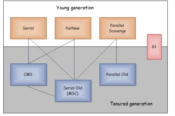 7种收集器,分为两块,上面为新生代收集器,下面是老年代收集器,存在连线两个收集器可以搭配使用,总的来讲分为:串行收集器、并行收集器、并发收集器。