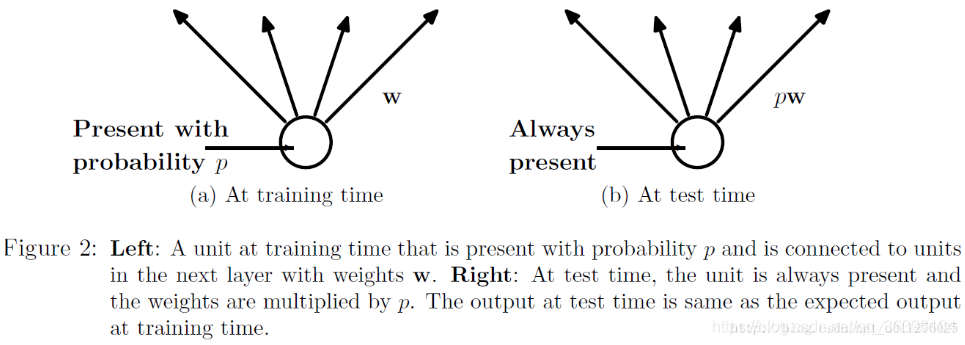 - 在训练中,每个隐层的神经元先乘概率P,然后在进行激活,在测试中,所有的神经元先进行激活,然后每个隐层神经元的输出乘P。