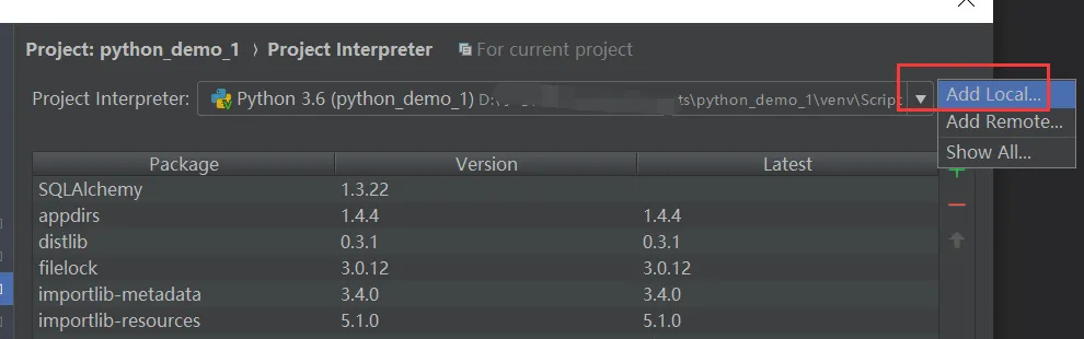 方式是通过 File---->Settings—>Project:python_deom_1(项目名)—>Project Interpreter---->Add Local