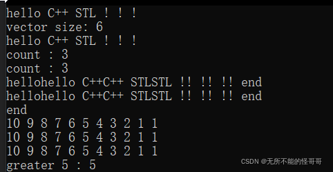 1. sort(v4.begin(), v4.end(), greater<int>()); //使用预定义函数对象 2. for_each(v4.begin(), v4.end(), _FroEachClass<int>()); 3. cout << endl;