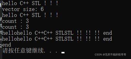 1. vector<string> v3(for_each_obj.get_count() + 1); 2. v3[6] = "end"; 3. transform(v1.begin(), v1.end(), v1.begin(), v3.begin(), _TransformClass<string>()); 4. for_each(v3.begin(), v3.end(), _FroEachClass<string>()); 5. cout << endl; 6. vector<string>::iterator it = transform(v1.begin(), v1.end(), v1.begin(), v3.begin(), _TransformFunc<string>); 7. for_each(v3.begin(), v3.end(), _FroEachClass<string>()); 8. cout << endl; 9. cout << *it << endl; //transform 返回的是: v1 + v2 最后一个元素相加后,后面的那个位置的迭代器