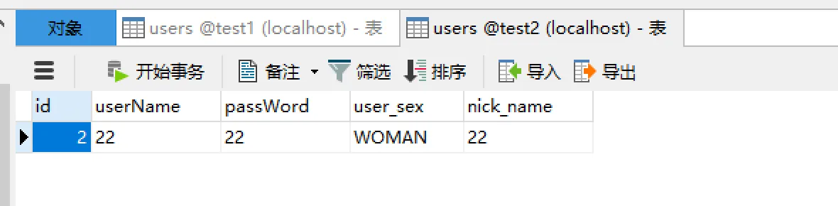 1、首先在数据库中创建主库test1和从库test2,然后添加表结构: