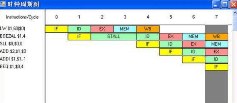 该窗口用于显示程序执行的时间关系,画出各条指令执行时所用的时钟周期。非流水方式下,没有该窗口。