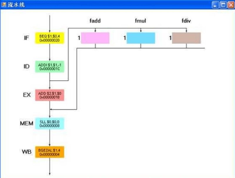 在该窗口中,每一个矩形方块代表一个流水段,它们用不同的颜色填充。在该窗口的左侧是IF到WB段,其右边为浮点部件。浮点部件分有浮点加法部件(fadd)、浮点乘法部件fmul)和浮点除法部件(fdiv)三种。在菜单“配置”“常规配置”中修改浮点部件个数,可看到该窗口中对应类型的浮点部件个数会发生相应的变化。