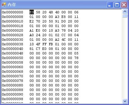 该窗口显示模拟器内存中的内容,左侧一栏为十六进制地址,右侧为数据,如图5所示。可以直接通过双击来修改其内容。这时会弹出一个“内存修改”对话框,如图6所示。对话框的上部区域为数据类型与格式选择区,通过勾选其中的一项,就可以指定所采用的数据类型与格式。