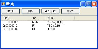 断点窗口列出当前已经设置的所有断点,每行一个。每行由3部分构成:地址(16进制),流水段名称,符号指令。如图7所示。(在非流水方式下,“段”没有意义)
