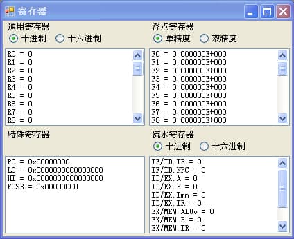 寄存器窗口显示MIPSsim模拟器中的寄存器的内容。共有4组寄存器:通用寄存器、浮点寄存器、特殊寄存器和流水寄存器,分为4栏来显示。每一栏下分别有各自的数据格式选项,如图2所示。