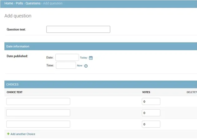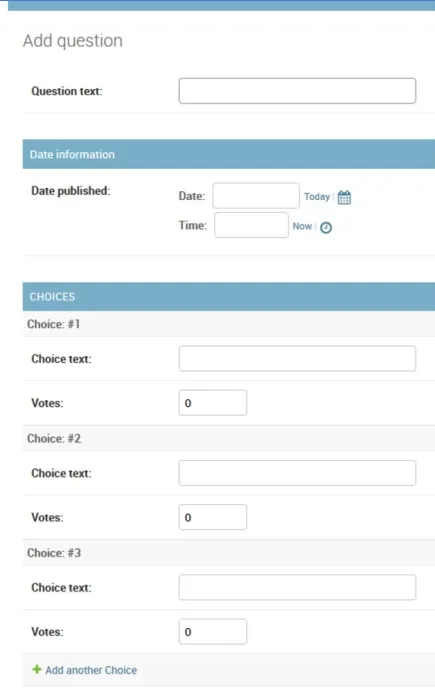 默认3个choice是由extra指定的,点击Add another Choice链接,自动新增一个Choice。