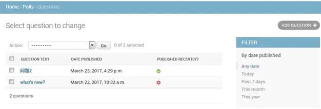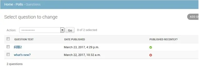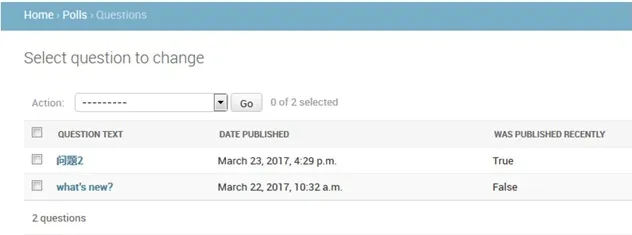 可点击列标题来排序,was_published_recently列除外,因为不支持按任意方法的输出排序。另外,was_published_recently列默认为方法名称(下划线替换了空格)。