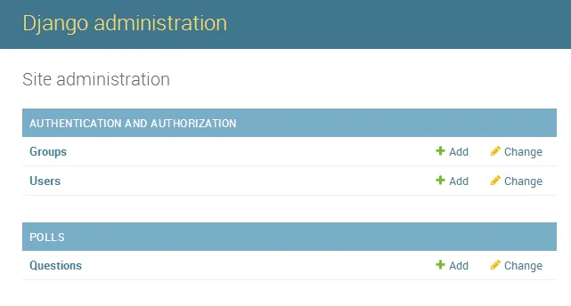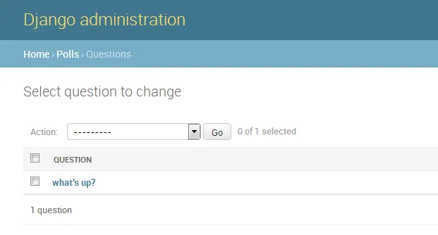 如上,没看到poll应用。要展示该页面,还需告诉admin,Question对象拥有admin接口。为了达到这个目的,打开polls/admin.py,按如下编辑