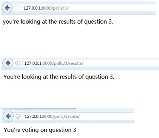 question_id=3 来自(?P<question_id>[0-9]+)。使用双括号于正则表达式,可捕获正则表达式匹配到的文本,然后当作参数发给view函数。?P<question_id>定义了用于匹配正则表达式的名称,即用来匹配函数关键词参数的pattern,[0-9]+用于匹配数字序列。