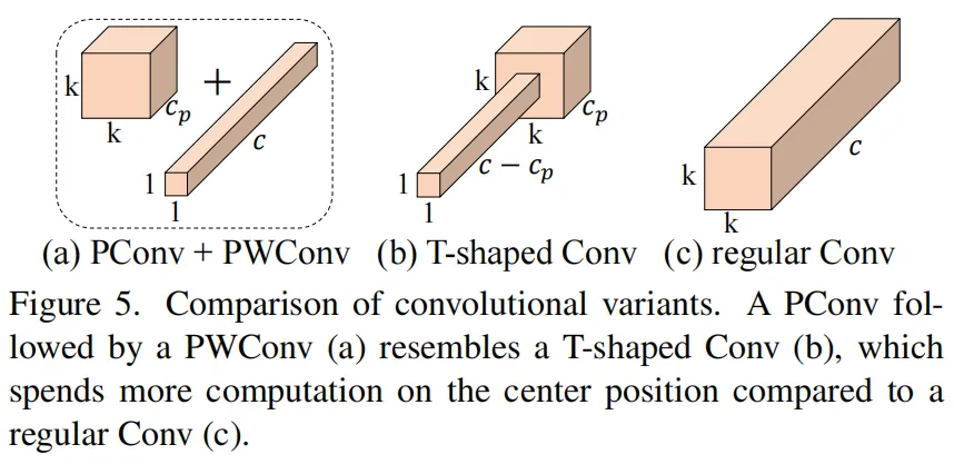 虽然T形卷积可以直接用于高效计算,但作者表明,将T形卷积分解为PConv和PWConv更好,因为该分解利用了滤波器间冗余并进一步节省了FLOPs。对于相同的输入和输出,T形Conv的FLOPs可以计算为: