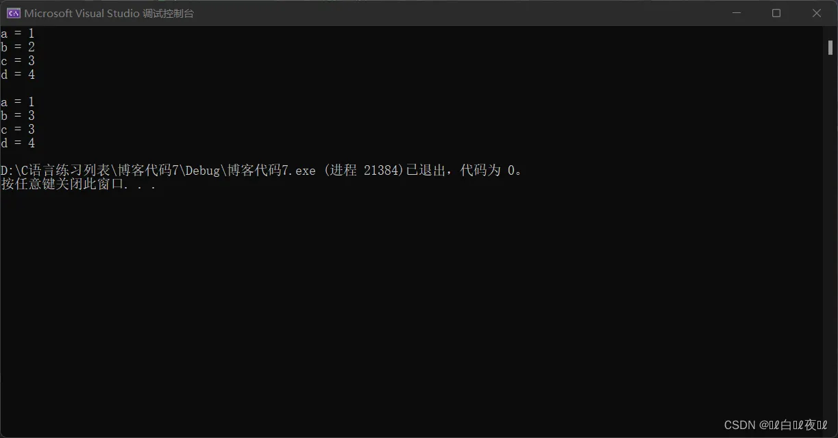 #include <stdio.h> int main() { int i = 0, a = 0, b = 2, c = 3, d = 4; i = a++ && ++b && d++; printf("a = %d\nb = %d\nc = %d\nd = %d\n", a, b, c, d); printf("\n"); i = 0, a = 0, b = 2, c = 3, d = 4; i = a++ || ++b || d++; printf("a = %d\nb = %d\nc = %d\nd = %d\n", a, b, c, d); return 0; } //程序输出的结果是什么?