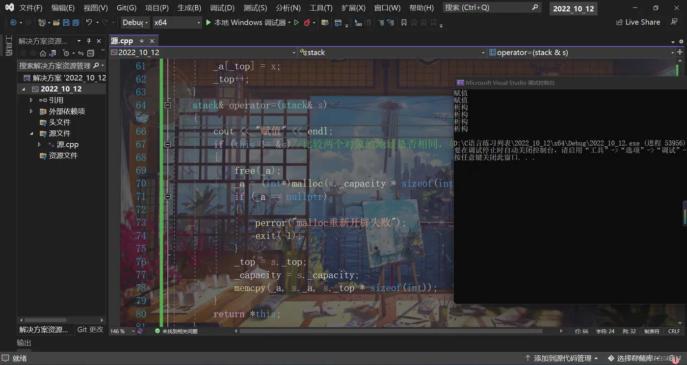 #include <iostream> using namespace std; class stack { public: stack(int capacity = 4) { _a = (int*)malloc(capacity * sizeof(int)); if (_a == nullptr) { perror("malloc开辟失败"); exit(-1); } _top = 0; _capacity = capacity; } ~stack() { cout << "析构" << endl; free(_a); _a = nullptr; _top = 0; _capacity = 0; } void Push(int x) { _a[_top] = x; _top++; } stack& operator=(stack& s) { cout << "赋值" <<endl; if (this != &s)//比较两个对象的地址是否相同,如果相同就是同一个对象 { free(_a); _a = (int*)malloc(s._capacity * sizeof(int)); if (_a == nullptr) { perror("malloc重新开辟失败"); exit(-1); } _top = s._top; _capacity = s._capacity; memcpy(_a, s._a, s._top * sizeof(int)); } return *this; } private: int* _a; int _top; int _capacity; }; int main() { stack s1; s1.Push(1); s1.Push(2); stack s2; s2.Push(3); s2.Push(4); s1 = s1; return 0; }