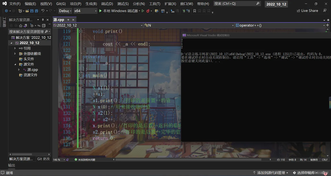 #include <iostream> using namespace std; class N { public: N(int x) { _a = x; } N& operator++()//前置++ { ++_a; return *this; } N operator++(int)//后置++,返回值不能用引用,因为返回的是临时数据 { N s(*this); ++_a; return s;//因为是后置++,所以返回的应该是++之前的数据 } void print() { cout << _a << endl; } private: int _a; }; int main() { N s1(1); ++s1; s1.print();//打印的是前置++的值 N x(0);//用来接收临时值 N s2(1); x = s2++; x.print();//打印的是后置++返回的临时值 s2.print();//打印的是后置++完毕的值 return 0; }