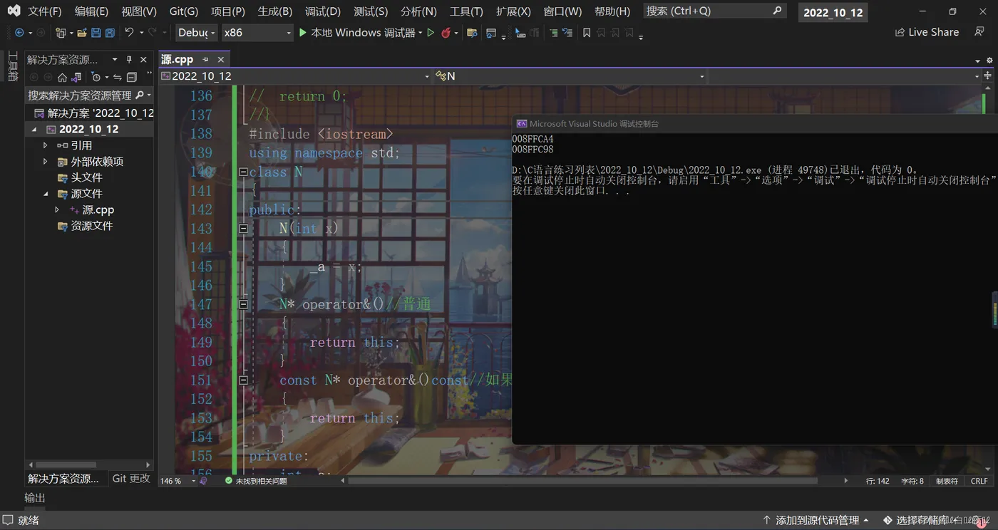 #include <iostream> using namespace std; class N { public: N(int x) { _a = x; } N* operator&()//普通 { return this; } const N* operator&()const//如果这里的返回值不加const就是权限放大 { return this; } private: int _a; }; int main() { N s1(1); const N s2(1); cout << &s1 << endl; cout << &s2 << endl; return 0; }