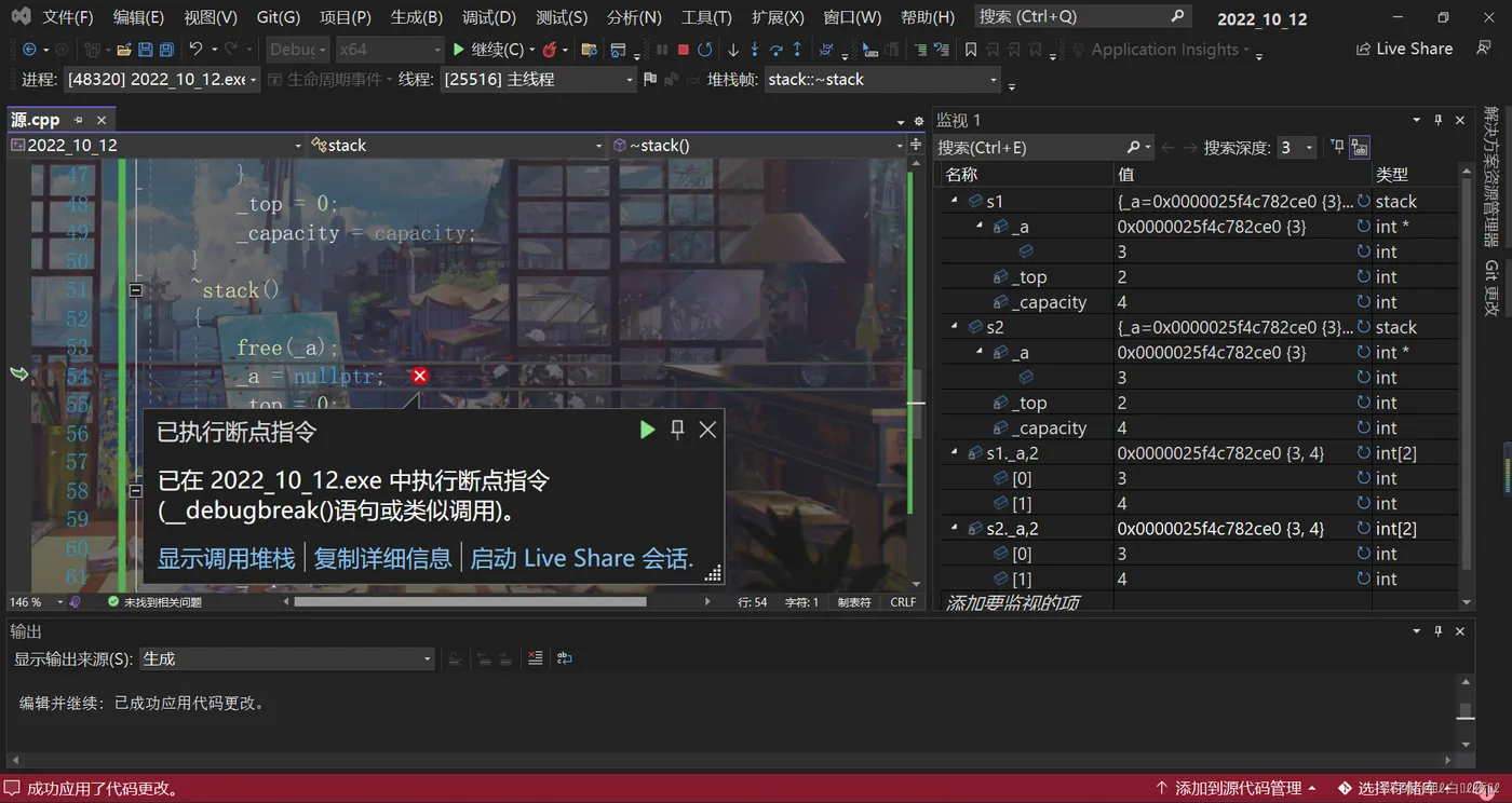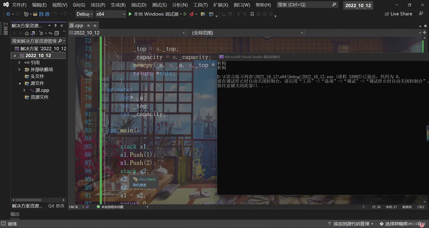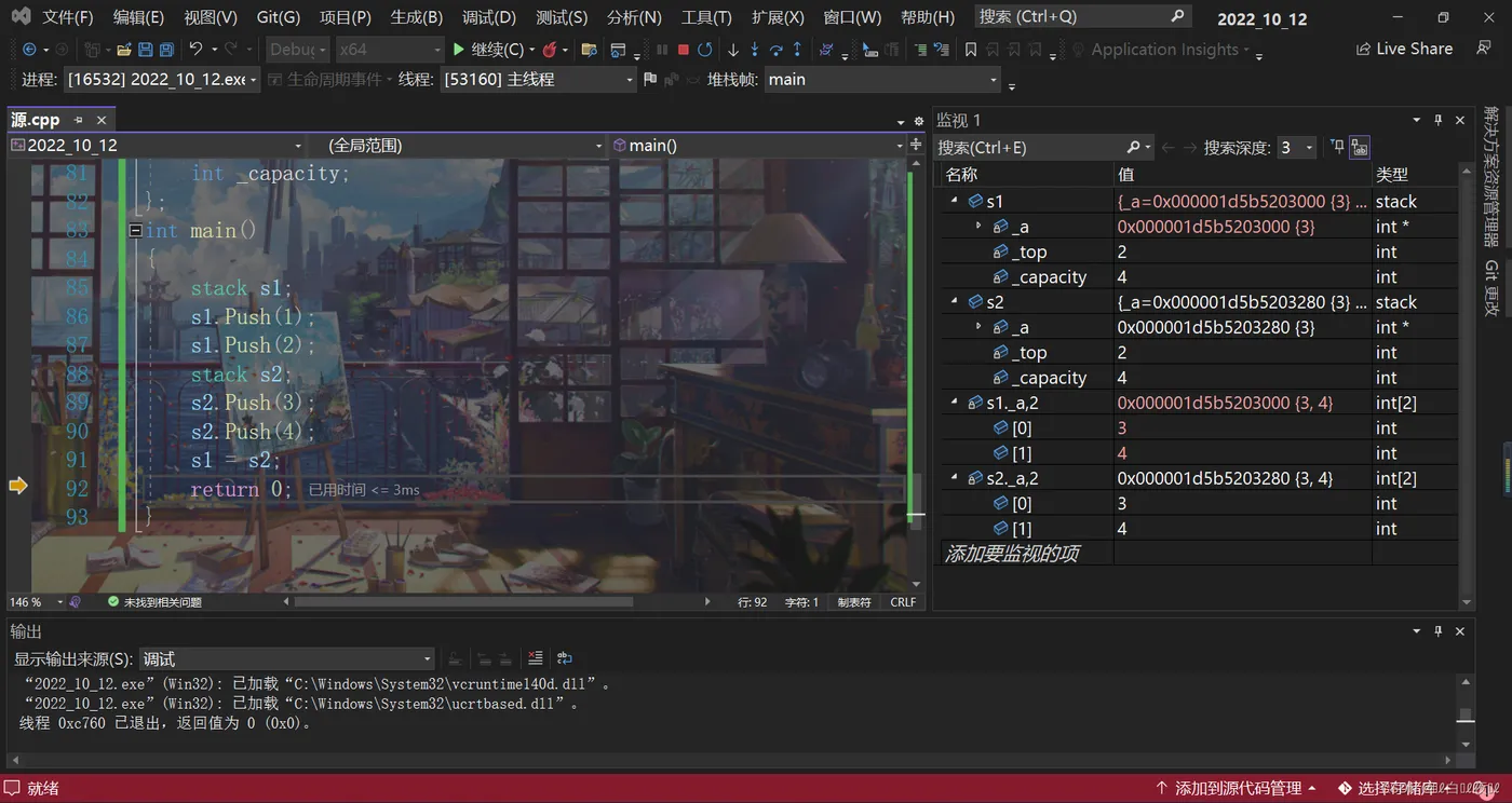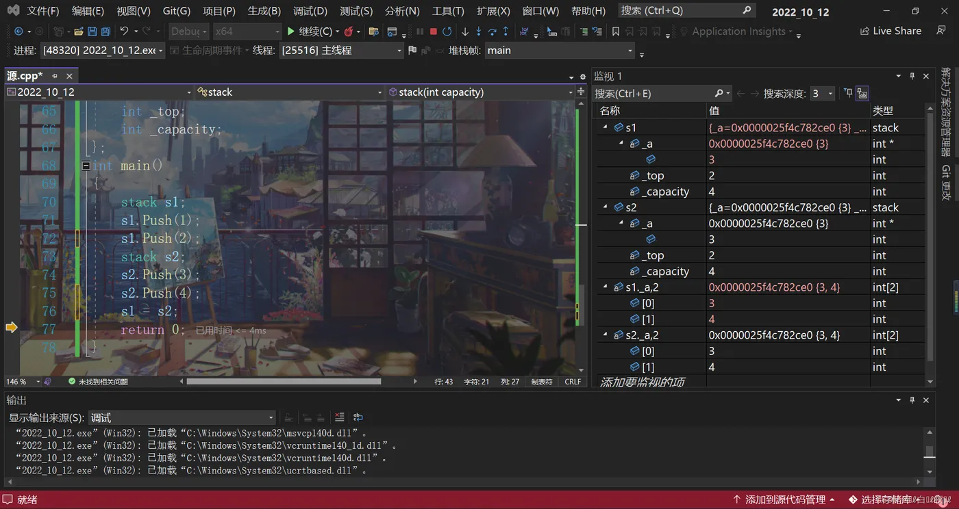 #include <iostream> using namespace std; class stack { public: stack(int capacity = 4) { _a = (int*)malloc(capacity * sizeof(int)); if (_a == nullptr) { perror("malloc开辟失败"); exit(-1); } _top = 0; _capacity = capacity; } ~stack() { free(_a); _a = nullptr; _top = 0; _capacity = 0; } void Push(int x) { _a[_top] = x; _top++; } private: int* _a; int _top; int _capacity; }; int main() { stack s1; s1.Push(1); s1.Push(2); stack s2; s2.Push(3); s2.Push(4); s1 = s2; return 0; }
