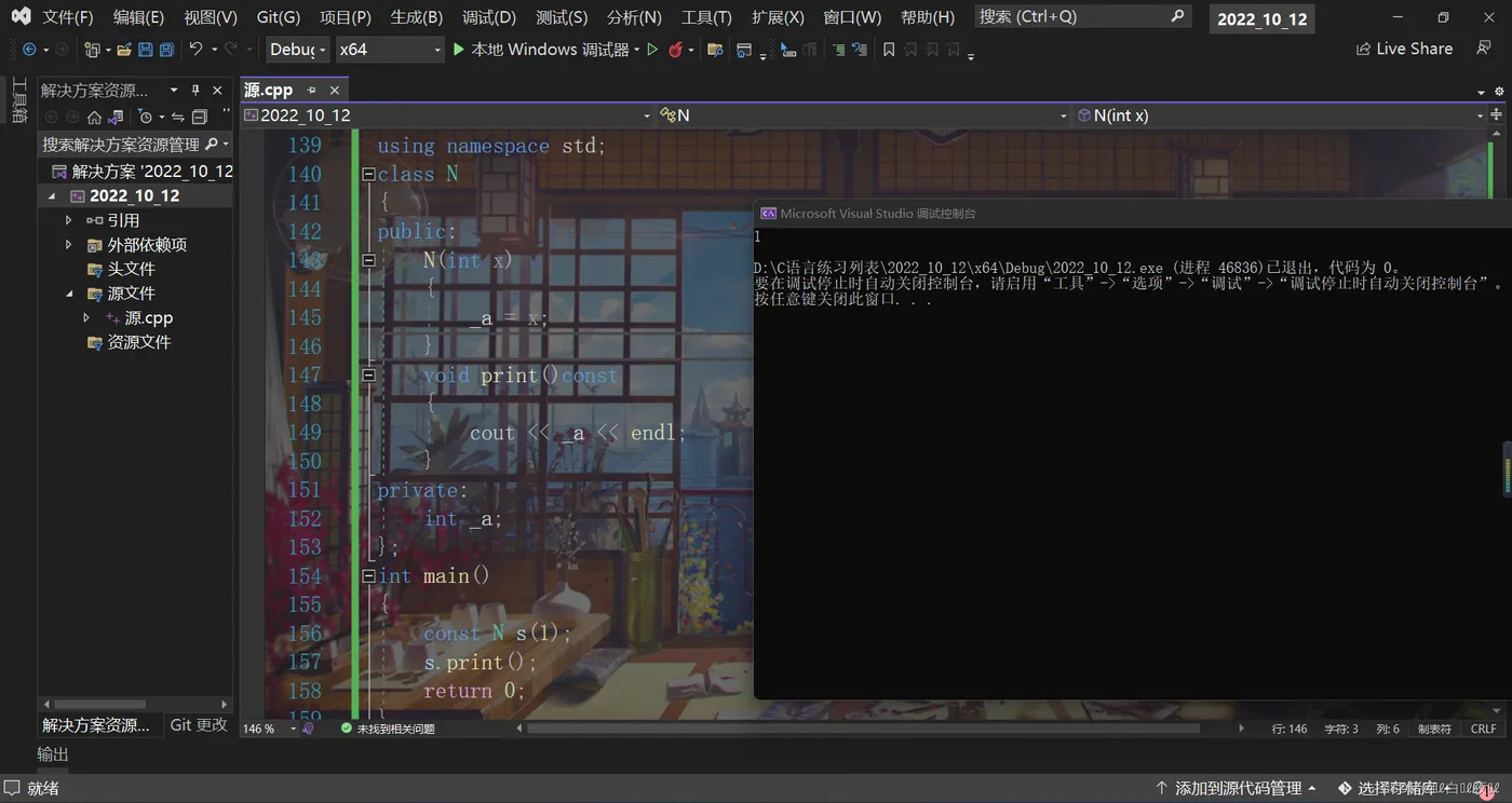 #include <iostream> using namespace std; class N { public: N(int x) { _a = x; } void print() { cout << _a << endl; } private: int _a; }; int main() { const N s(1);//这里初始化的对象s有了const属性 s.print(); return 0; }