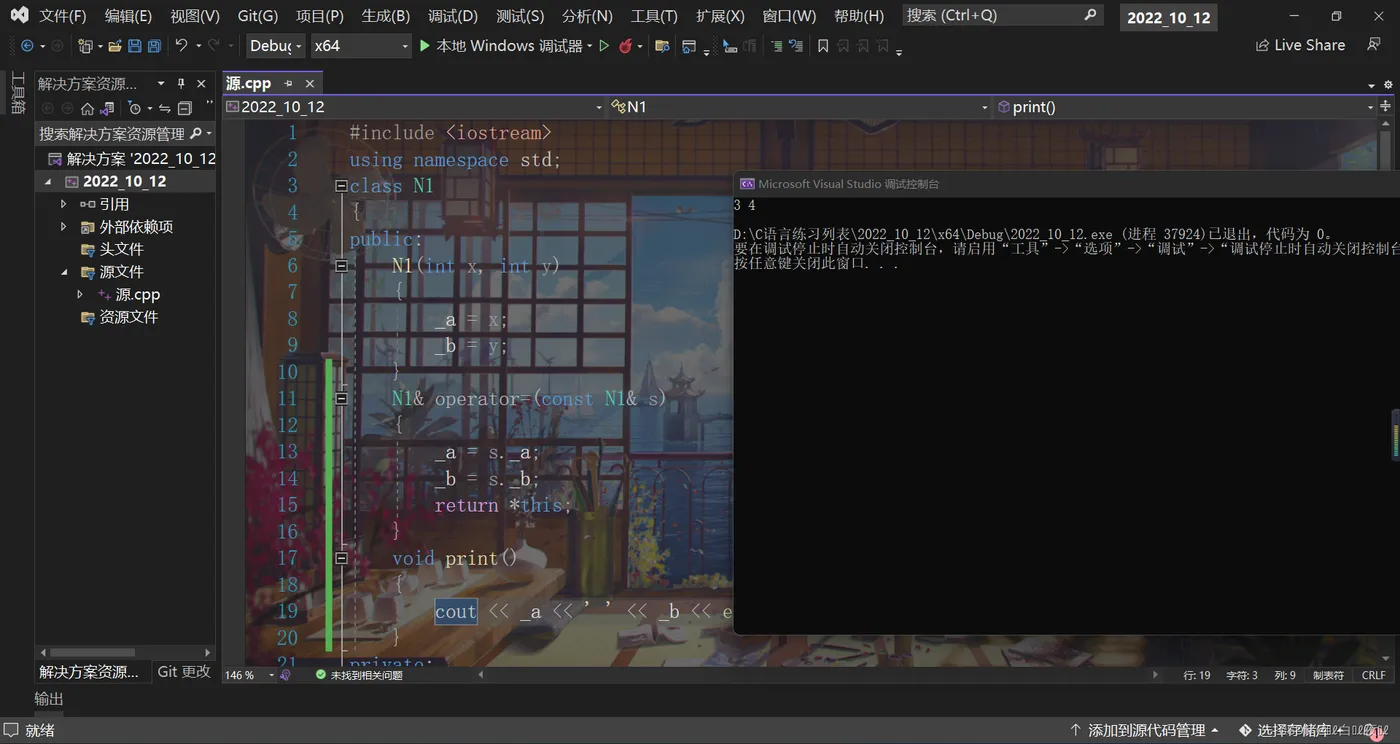 #include <iostream> using namespace std; class N1 { public: N1(int x, int y) { _a = x; _b = y; } //赋值运算 N1& operator=(const N1& s)//这里也可以不用引用,但是效率会降低,因为传值传的是构造体的拷贝 { _a = s._a; _b = s._b; return *this;//返回值是s1,一般返回的都是左值 } void print() { cout << _a << ' ' << _b << endl; } private: int _a; int _b; }; int main() { N1 s1(1, 2); N1 s2(3, 4); N1 s3(5, 6); s3 =s1 = s2; s3.print(); return 0; }