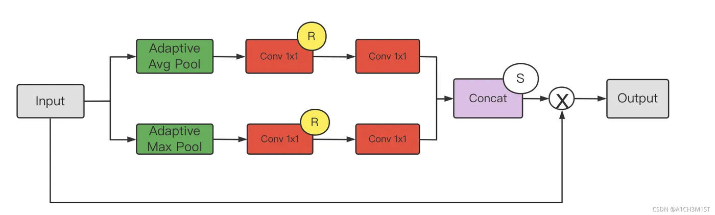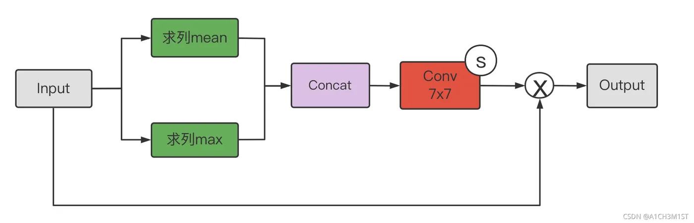 首先将通道本身进行降维,分别获取最大池化和均值池化结果,然后拼接成一个特征图,再使用一个卷积层进行学习。