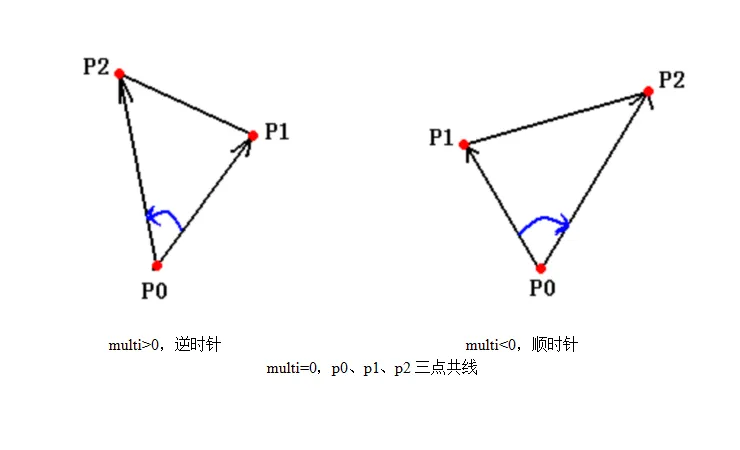 我们注意Cross的正负是有特殊含义的。如下图,Multi即为Cross,以p0为参考点,下图为向量p0p1和p0p2的叉积。如果Cross大于0,则p0p2在p0p1的逆时针方向,p0在p1p2的左边。反之,如果Cross小于0,则p0p2在p0p1的顺时针方向,p0在p1p2的右边。特殊的,当Cross等于0,p1、p2、p0三点共线。