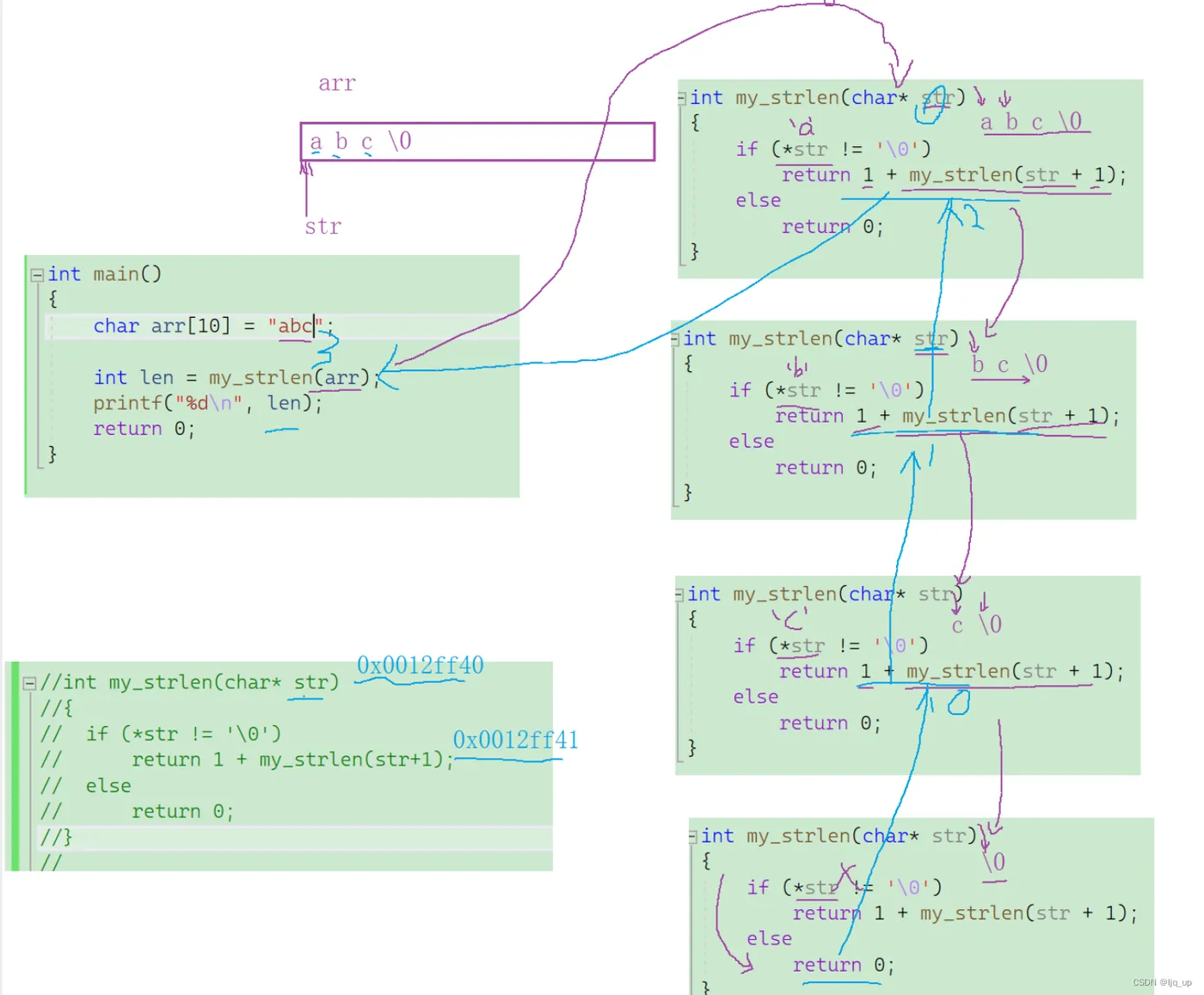详解:因为数组名代表数组的首地址,所以str就是a的地址,str+1就是b的地址,因为最开始str里是a!=‘\0’,所以进入if语句,return 1+my_strlen(str+1),调用my_strlen()函数不过是从b的地址开始,如此以往,当str='\0’时,就不会进入if语句返回0,然后返回到上一个return 1+my_strlen(str+1),就变成了1+0=1,返回值变成了1,在返回上一个return 1+my_strlen(str+1),就变成1+1=2返回值变成2,依次最终求出结果是3。
