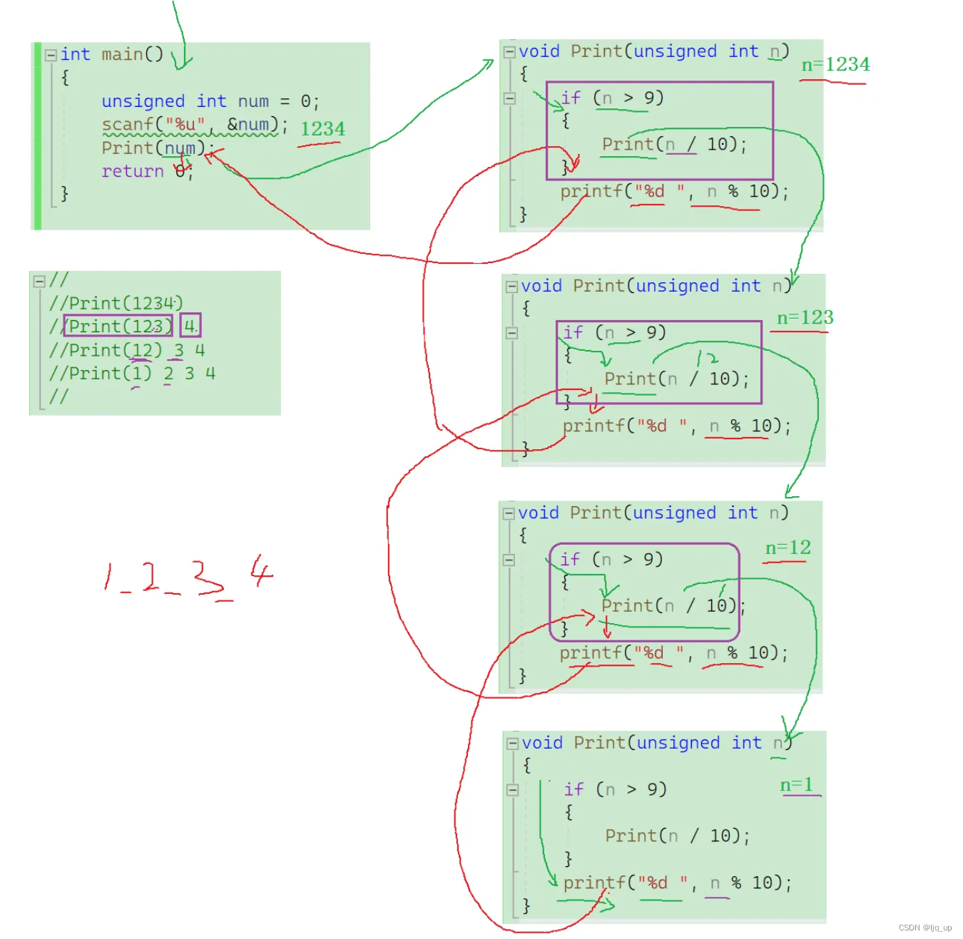 详解:当输入n=1234时,调用Print函数,经过if语句1234/10变成123再次调用Print函数,再次经过if语句,123/10变成12再次调用Print函数,再次经过if语句,12/10变成1再次调用Print函数,然后经过if语句因为不满足if语句条件,所以不进入不再调用Print函数,然后打印1%10=1,依次返回12%10=2;123%10=3,1234%10=4,依次打印