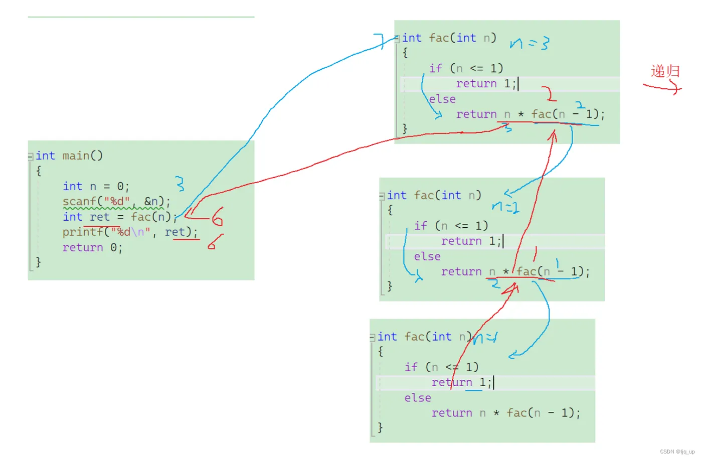 (1).一个函数在它的函数体内调用它自身称为 递归调用 ,这种函数称为 递归函数 。 执行递归函数将反复调用其自身,每调用一次就进入新的一层,当最内层的函数执行完毕后,再一层一层地由里到外退出。