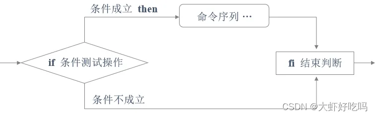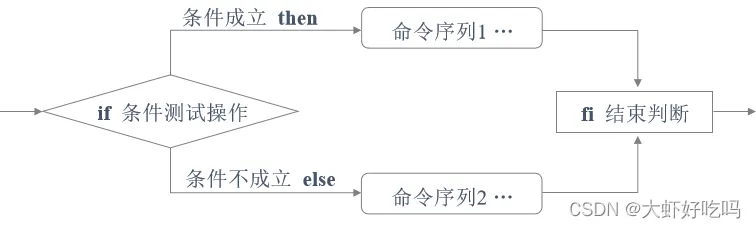 首先判断条件测试操作的结果,如果条件成立,则执行then后面的命令序列1,忽略else及后面的命令序列2,直到遇见fi命令判断;如果条件不成立,则忽略then及后面的命令序列1,直接跳至else后面的命令序列2并执行,知道遇见fi结束判断。