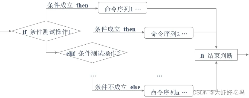 首先判断条件测试操作1的结果,如果条件1成立,则执行命令序列1,然后跳至fi结果结束判断;如果条件1不成立,则继续判断条件测试操作2的结果,如果条件2成立,则执行命令序列2,然后跳至fi结束判断......(可以有n个条件测试操作和命令序列)如果所有的条件都不满足,则执行else后面的命令序列n,直到遇见fi结束判断。