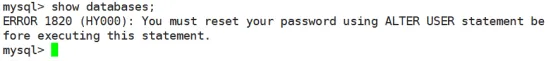 而如果使用默认密码登录,在数据库中是做不了其他操作的(如下图所示),需要先修改密码。