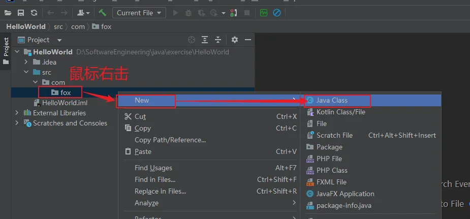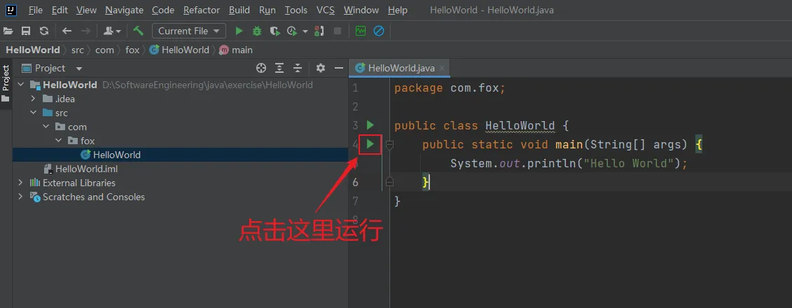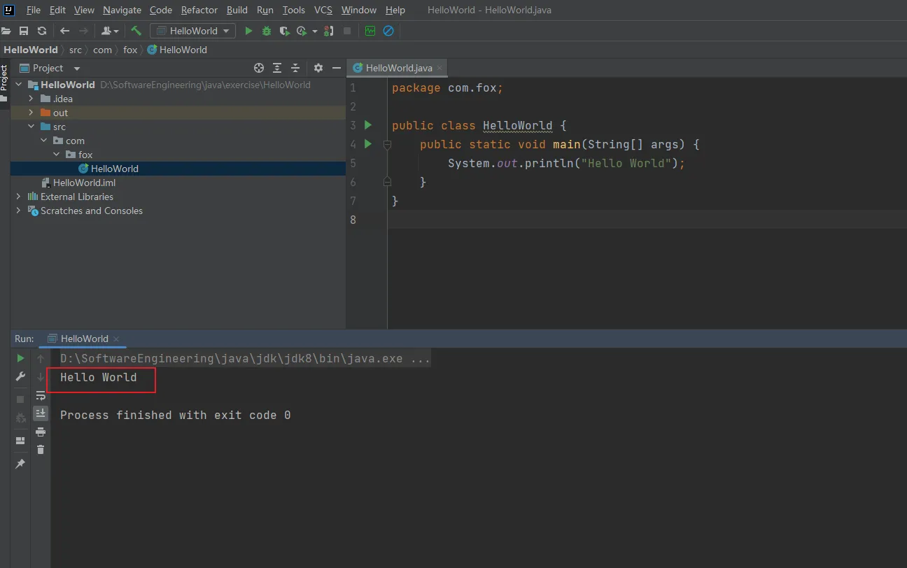 package com.fox; public class HelloWorld { public static void main(String[] args) { System.out.println("Hello World"); } }