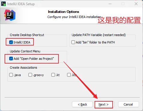 Create Desktop Shortcut:创建桌面快捷方式图标,建议勾选Update context menu:是否将从文件夹打开项目添加至鼠标右键,根据需要勾选Create Associations:idea关联文件格式,不推荐勾选,由于idea是重量级的软件,因此打开单个文件一般都是使用如Sublime Text、EditPlus等轻量级文本编辑器打开Update PATH variable (restart needed):是否将IDEA启动目录添加到环境变量中,即可以从命令行中启动IDEA,根据需要勾选。但是我们一般都用自己的,即我们在安装 JDK 时都会自己配置好与下载的JDK相关联的环境变量。