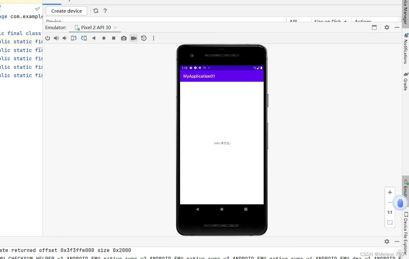 4.开发工具安装好后,创建一个新的工程。并创建模拟器,为模拟器安装系统镜像,修改项目运行时显示的Hello World为“hello+自己的姓名”,运行project,将项目部署到模拟器上。如未出现报错情况,则为开发环境安装成功。