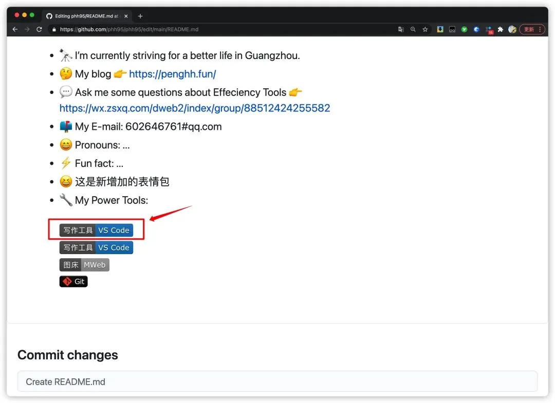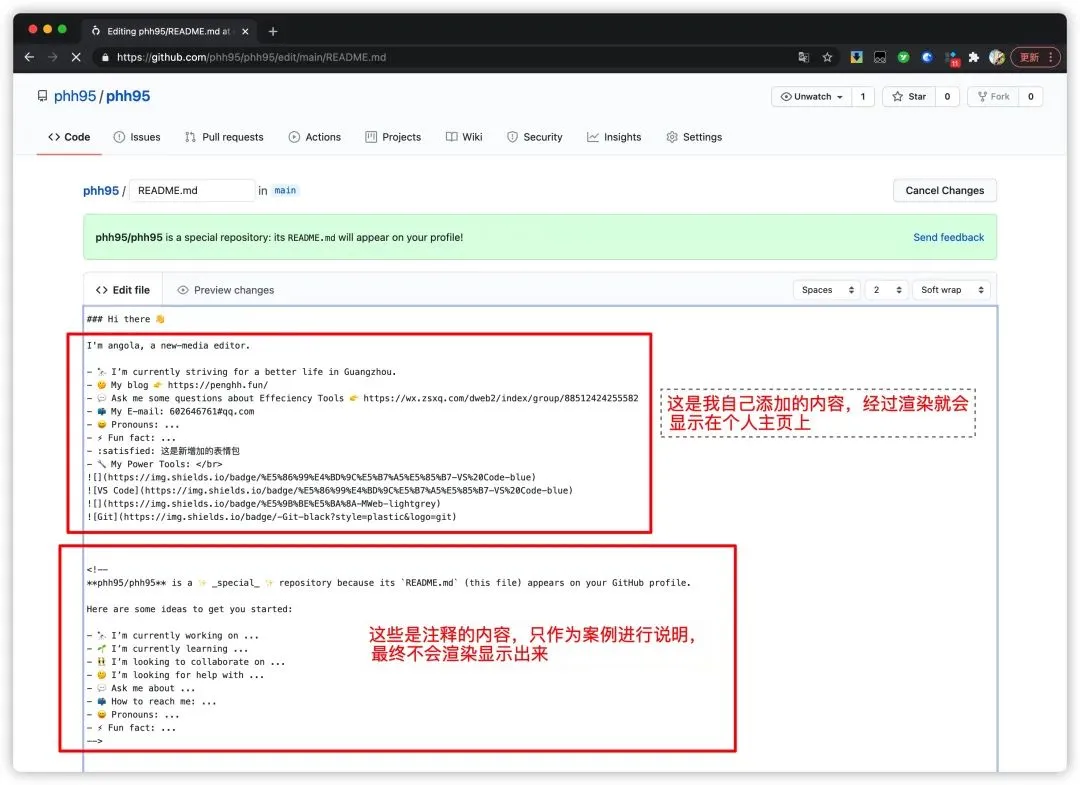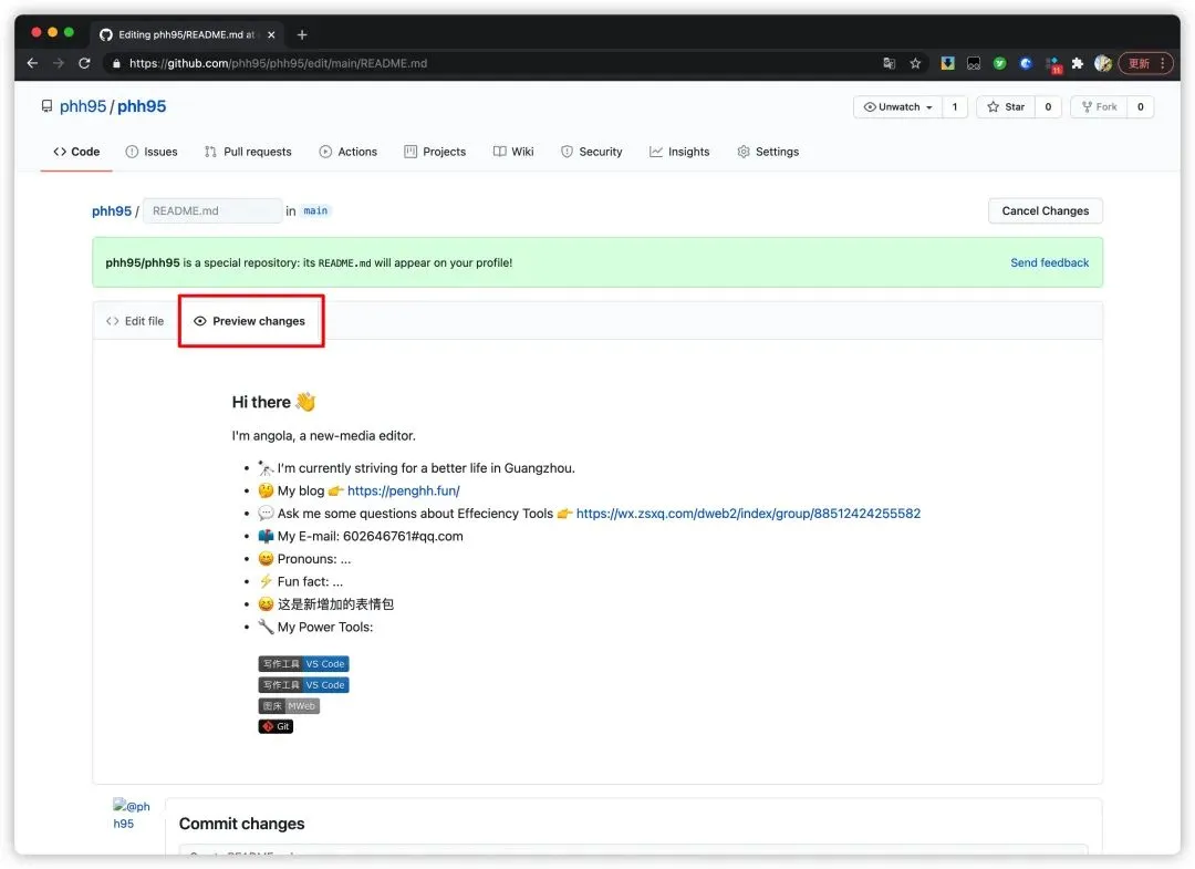 编辑的过程中,点击上方的「Preview changes」选项卡,查看 Markdown 渲染后的效果。