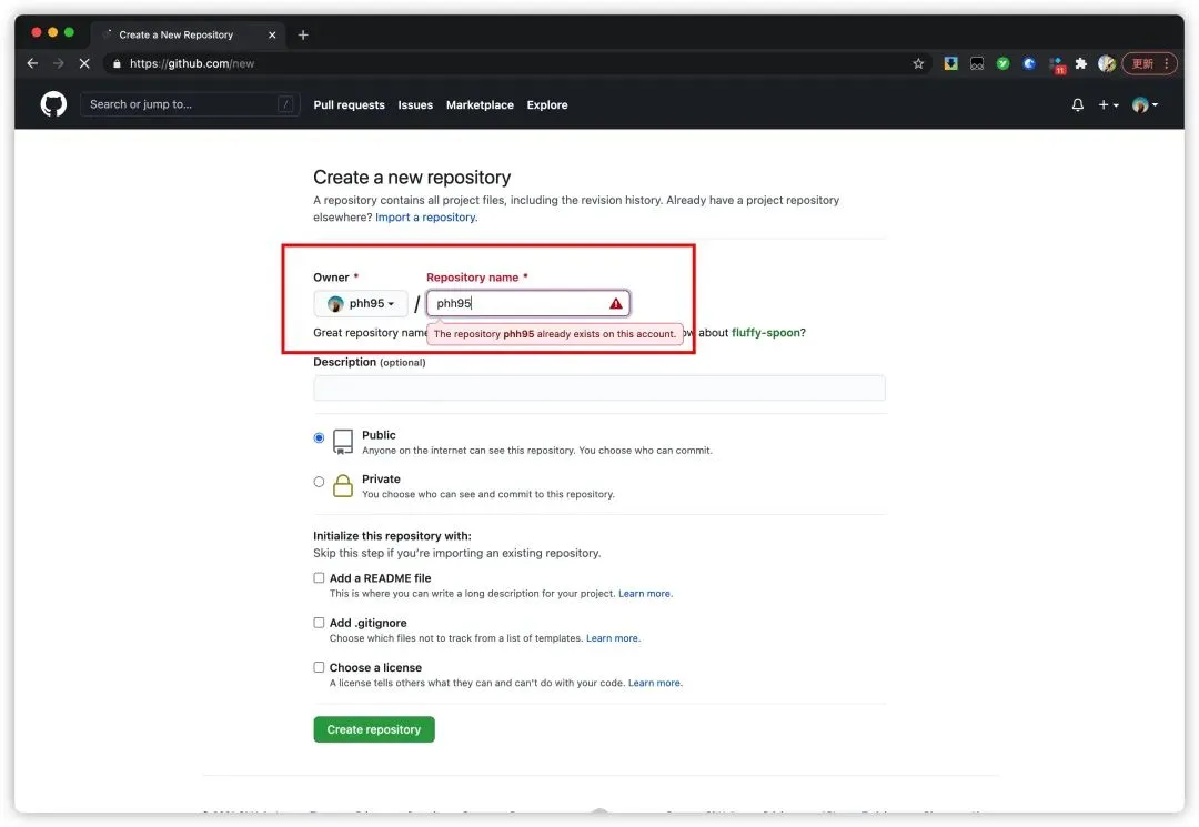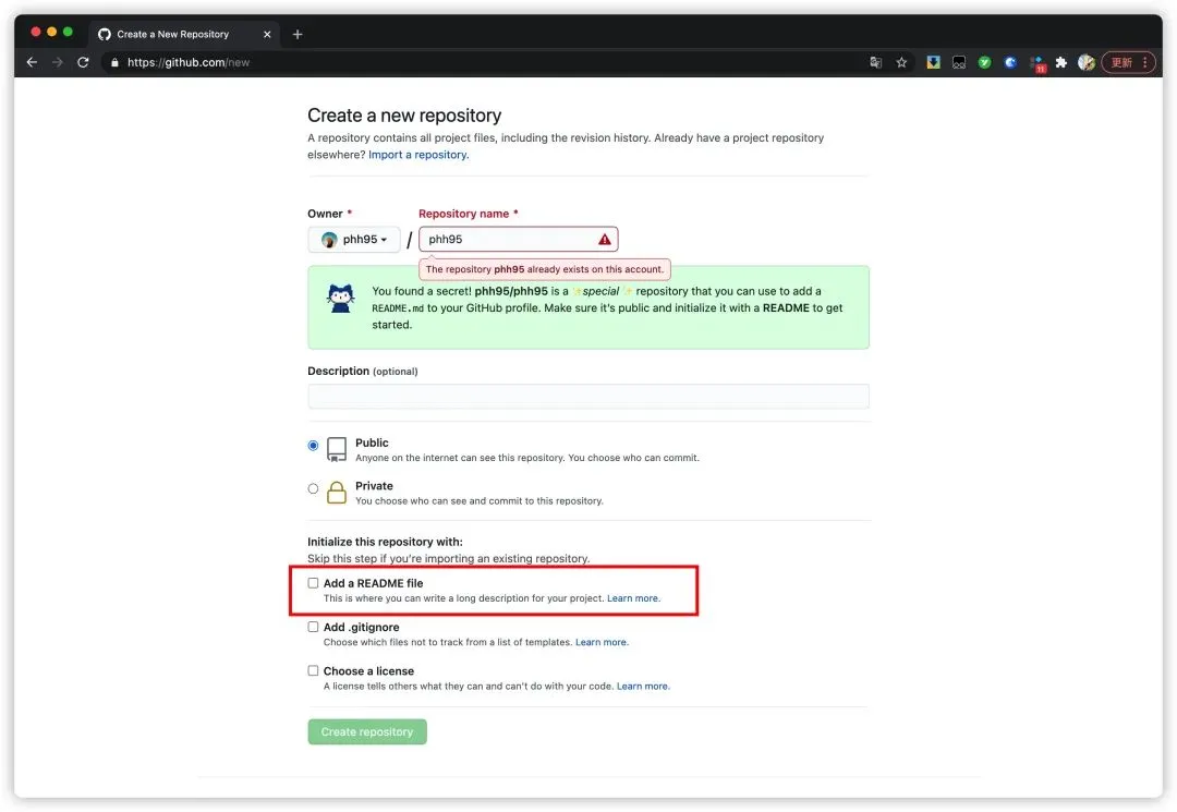 下面简单讲一下实现方法:在 GitHub 中创建一个与 GitHub ID 同名的仓库,例如我的 GitHub ID 为 phh95,因此创建的仓库名也为 phh95。由于我已创建了这个仓库,所以 GitHub 会在下方提示我已经创建过同名的仓库了。