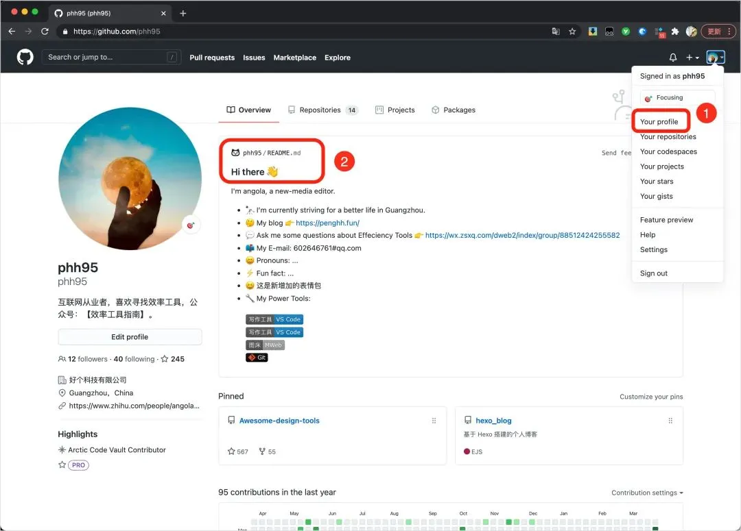 创建仓库之后,点击右上角的个人头像,选择「Your profile」回到你的 GitHub 主页,你应该就可以看到 Hi there 👋 的文本内容。