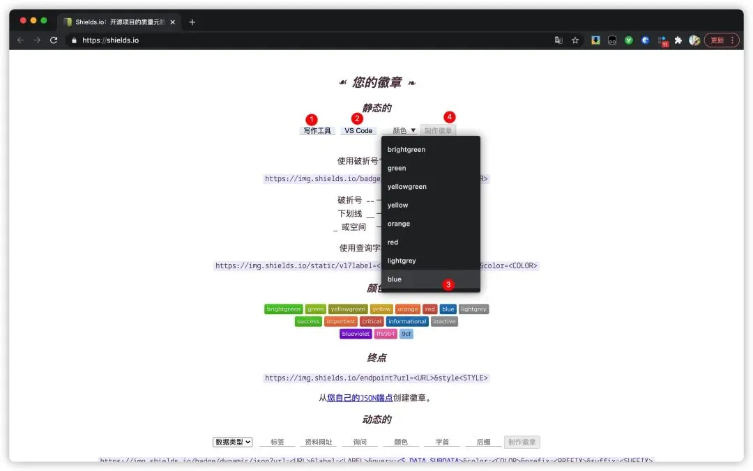 这是个外国的网站,我使用浏览器自带的翻译功能将其翻译成中文。前面我们说的小牌子,对应的英文为 BADGE,浏览器翻译为了「徽章」。以前面的小牌子「写作工具|VS Code」为例,生成这个小牌子的方法如下:在网页 Shields.io 从左到右的三条短横线上填写:写作工具、VS Code、以及从颜色库中挑选一个颜色(这个颜色决定了第二个文本 VS Code 的背景色),最后点击右侧的「制作徽章」。