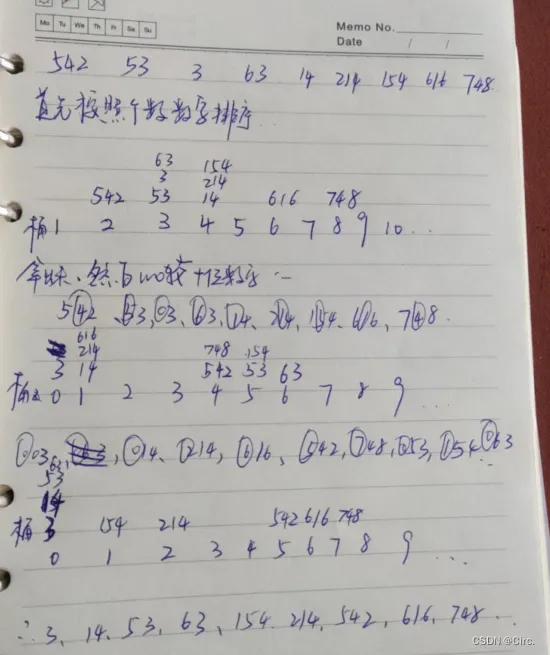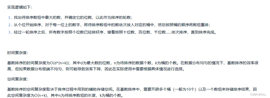 public class BasicData { public static void radixSort(int[] arr) { // 找到数组中的最大值,确定排序的轮数 int max = Arrays.stream(arr).max().getAsInt(); // 对每个位数进行排序 for (int exp = 1; max / exp > 0; exp *= 10) { countingSort(arr, exp); } } private static void countingSort(int[] arr, int exp) { int n = arr.length; int[] output = new int[n]; int[] count = new int[10]; // 统计每个桶中元素的个数 for (int i = 0; i < n; i++) { int index = (arr[i] / exp) % 10; count[index]++; } // 将count[i]更新为该位数小于等于i的元素个数 for (int i = 1; i < 10; i++) { count[i] += count[i - 1]; } // 从后向前遍历原数组,根据当前位数将元素放入对应的桶中 for (int i = n - 1; i >= 0; i--) { int index = (arr[i] / exp) % 10; output[count[index] - 1] = arr[i]; count[index]--; } // 将排序好的数组复制回原数组 System.arraycopy(output, 0, arr, 0, n); } public static void main(String[] args) { int[] arr = {170, 45, 75, 90, 802, 24, 2, 66}; System.out.println("Original array: " + Arrays.toString(arr)); radixSort(arr); System.out.println("Sorted array: " + Arrays.toString(arr)); }