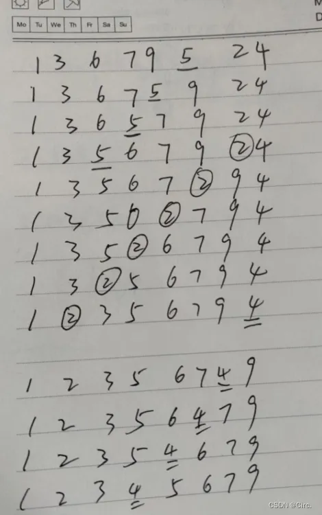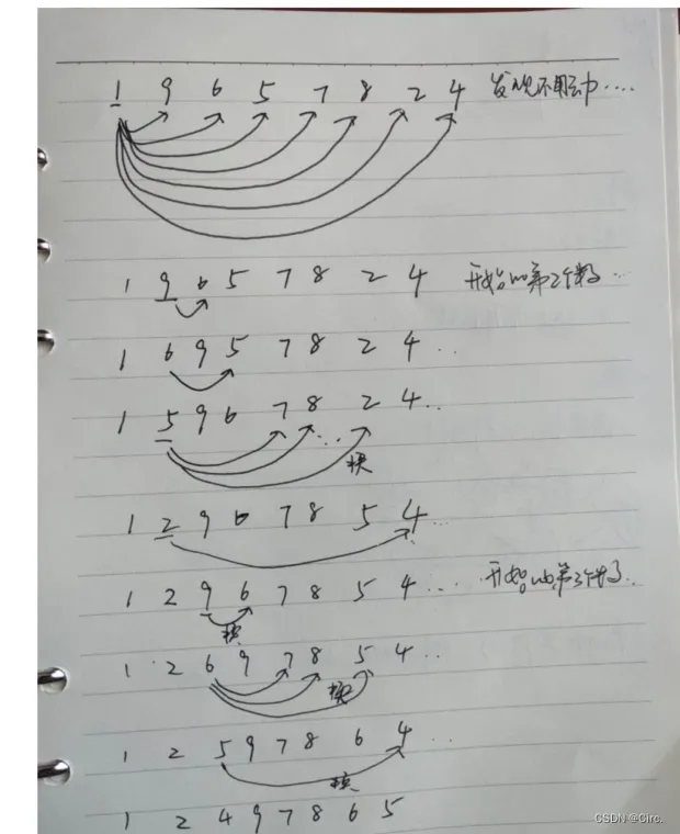 public static void main(String[] args) { int arrLength = 8; //测试数组的长度 /* * 获得随机arrLength个数的数组 */ int[] arr = new int[arrLength]; for(int i = 0;i < arrLength;i++){ //随机情况 arr[i] = (int) (Math.random() * arrLength); } //排序前的输出 for(int a:arr){ System.out.print(a+" "); } System.out.println(); choiceSort(arr); //排序后的输出 for(int a:arr){ System.out.print(a+" "); } } /** * 直接选择排序,每次选最小的放到最前 */ public static void choiceSort(int[] arr){ if(arr == null || arr.length < 1){ return; } int min = 0; int temp; /*只需要进行 n - 1 轮选择*/ for(int i = 0;i<arr.length - 1;i++){ min = i; //初始化当前最小的 for(int j = i + 1;j<arr.length;j++){ if(arr[min] > arr[j]){ min=j; //记住最小元素下标 } } //一轮后,当最小元素的下标不为i时交换位置 if(min != i){ temp = arr[i]; arr[i] = arr[min]; arr[min] = temp; } System.out.println(Arrays.toString(arr)); } }