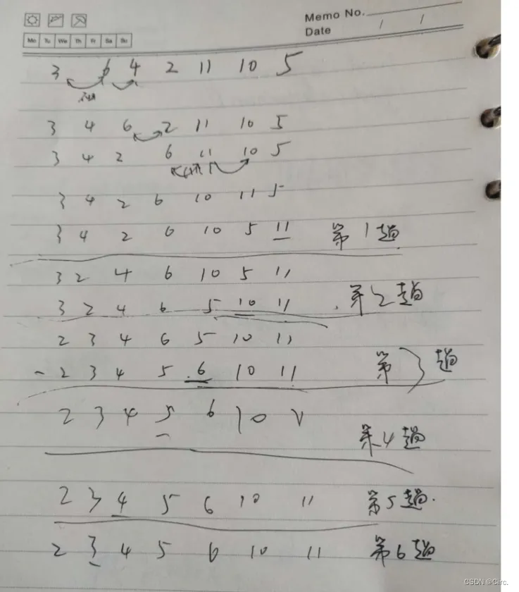 public static void main(String[] args) throws Exception { int[] arr = {11,44,23,67,88,65,34,48,9,12}; sort(arr); } public static int[] sort(int[] sourceArray) throws Exception { // 对 arr 进行拷贝,不改变参数内容 int[] arr = Arrays.copyOf(sourceArray, sourceArray.length); //遍历整个数组 for (int i = 1; i < arr.length; i++) { // 设定一个标记,若为true,则表示此次循环没有进行交换,也就是待排序列已经有序,排序已经完成。 boolean flag = true; for (int j = 0; j < arr.length - i; j++) { if (arr[j] > arr[j + 1]) { int tmp = arr[j]; arr[j] = arr[j + 1]; arr[j + 1] = tmp; flag = false; } } if (flag) { break; } System.out.println(Arrays.toString(arr)); } return arr; }