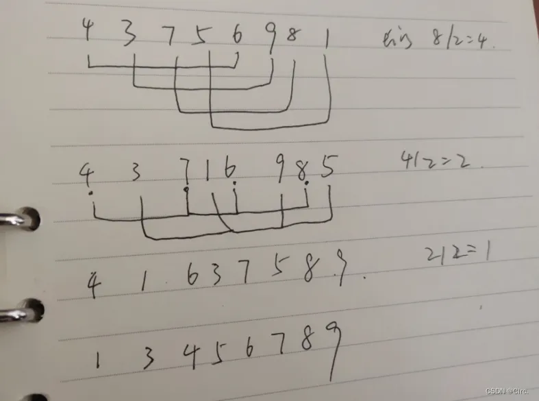 public static void main(String[] args) { int[] a = {1,2,5,4,3,9}; ShellSort(a); } public static void ShellSort(int[] array) { int n = array.length; int inc;//希尔增量 //这里采用朴素希尔增量,就是每次增量都是原来的一半,直到增量为1为止 for (inc = n / 2; inc >= 1; inc = inc / 2) {//每一次循环都通过不断缩短增量达到排序的效果 //在一次循环内,inc的值是固定的 //下面的内容和插入排序的原理是一样的,只不过每个待排序元素的间隔是inc for (int i = inc; i < n; i++) {//i为什么是从inc开始,而不是从0开始? //因为插入排序中把排序元素分为两组,A组为已排好序的,B组为未排好序要插入的 //A组开始时往往是第一个元素(0),那么B组的第一个元素就是整个待拍序列的第二个元素了(inc) int temp = array[i];//temp存储要插入的值 int j; for (j = i-inc; j >= 0 && array[j] > temp; j = j - inc) {//j从i-inc开始往前遍历,每一步的距离是inc array[j+inc] = array[j];//如果当前遍历到的元素(这里说的遍历到的元素是(array[j])比待插入元素temp小, //这个元素往后移动一位,后边的元素被元素覆盖 //一旦不满足条件,1.说明要么遍历到元素比temp小,这个时候所有比temp大的元素都后移完了 //2.遍历到头了,此时第一个元素就是要插入的地方 } array[j+inc] = temp; //那么此时array[j+inc]也就是要插入的地方,把temp插入进去 System.out.println(Arrays.toString(array)); } } // System.out.println(Arrays.toString(array)); }