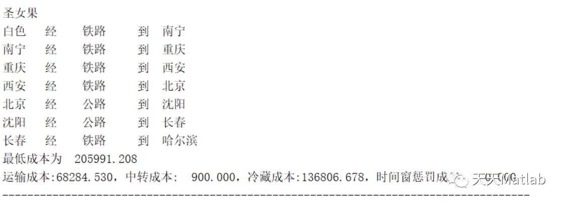基于遗传算法的多种农产品冷藏环境下多式联运路径规划是一个复杂的问题。它涉及到多个因素,包括不同农产品的特性、冷藏环境要求、多式联运的可行性和效率等。数据准备:收集相关农产品的信息,包括产地、目的地、数量、保鲜要求等。同时,需要了解不同运输方式(如航空、铁路、公路等)的特点,包括运输时间、成本、容量等。问题建模:将路径规划问题转化为数学模型。可以使用图论中的网络模型来表示各个产地和目的地之间的连接关系,节点表示产地和目的地,边表示不同运输方式之间的路径。同时,需要定义适当的目标函数,如最小化总运输成本、最小化总运输时间等。遗传算法初始化:初始化遗传算法的参数,包括种群大小、交叉率、变异率等。同时,需要定义适合该问题的染色体编码方式,以及相应的遗传操作(如交叉和变异)。适应度函数定义:根据问题建模中定义的目标函数,设计适应度函数来评估每个个体的优劣。适应度函数可以考虑多个因素,如总运输成本、总运输时间以及冷藏环境的合规性等。遗传算法迭代优化:通过遗传算法的迭代优化过程,不断生成新的个体,并根据适应度函数对个体进行选择、交叉和变异操作,以逐步优化路径规划的解。评估与调优:在每一代迭代后,评估当前最优解的性能,并根据需要进行调优。可以根据实际情况,对遗传算法的参数进行调整,以获得更好的路径规划结果。