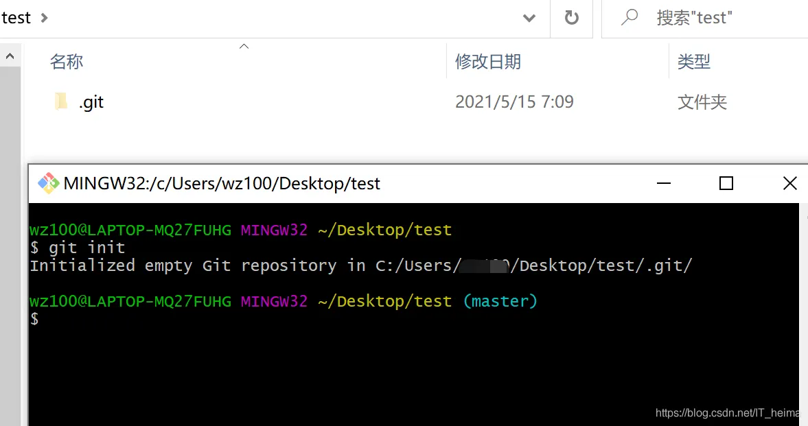 - 在电脑的任意位置创建一个空目录(例如test)作为我们的本地Git仓库